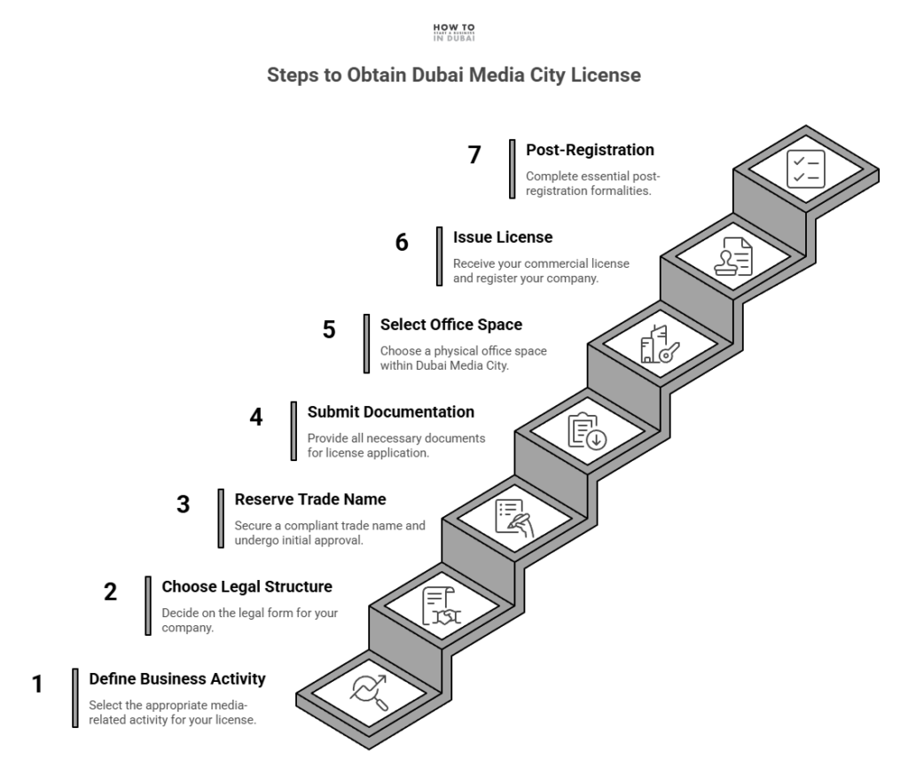 With finalization of business structure and activity, the Dubai Media City company registration starts with trade name compliant. This name must follow UAE naming conventions and reflect the specific business activity.